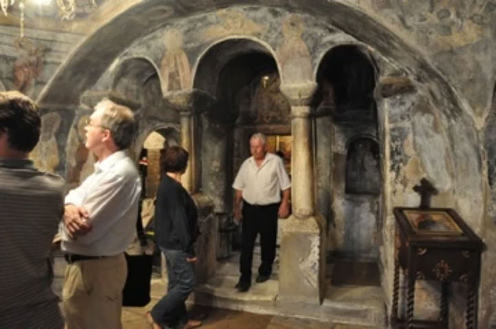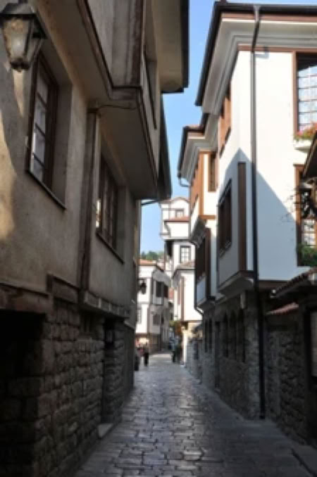 In media vetereque urbe visimus effossiones archæologicas basilicæ Byzantinæ, arcem, meschitam septimi decimi sæculi, ecclesiam orthodoxam quinti decimi sæculi cuius sacerdos nos affabiliter accipit verbaque facit de novissimis ecclesiæ catholicæ scandalis, quæ, ait, non accidissent si sacerdotibus permitteretur matrimonium. Infeliciter picturæ parietales fere omnes tempore dictaturæ sunt deletæ, cum ecclesiæ factæ sunt stabula militaria. Paulo longius unicum exemplum veteris architecturæ domesticæ nobis monstrat quantum urbes olim fuerint pulchræ; hæc domus nunc facta est museum ethnologicum. In via levem audimus musicam, coloribus orientalibus tinctam, quam mystagogus dicit propriam esse huius urbis.