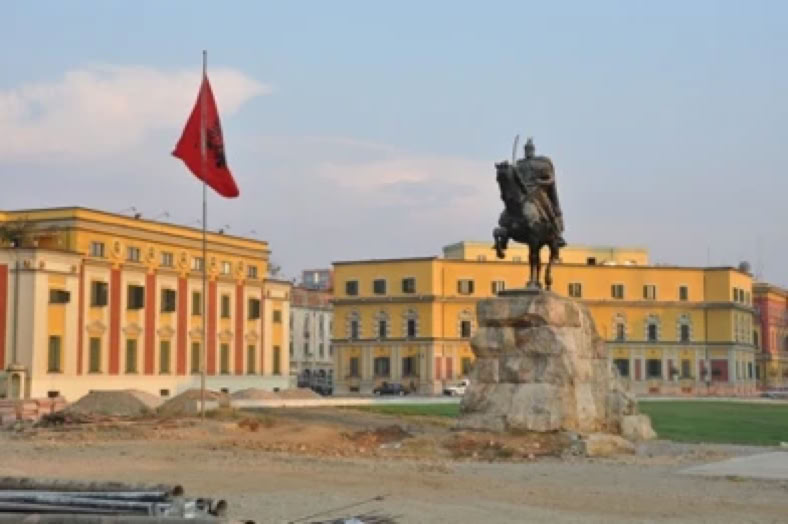 Plateam præcipuam petimus, ab heroe nationali Skanderbeg vocatam; ibi cum sempiterna fiant opera structoria homines ambulant pulvere convoluti. In medio, ut decet, posita est herois magna statua equestris; ille Skanderbeg sive Georgius Castriotus (1405-1468), nobilis adulescens Sultano datus ut obses, in aula Turcica educatus milesque factus, titulum acceperat Iskander Bey, unde nomen Skanderbeg; postea relictis Othomanis factus est christianorum defensor moxque Albaniæ dominus. In eadem platea, præter horribile Palatium Culturæ, visu digna est parva meschita Et’Hem Bey, intus et foris pulchris picturis ornata. Hac occasione novam rem audimus mirabilem: in Albania, aliter ac in toto (nisi fallor) orbe terrarum, nulla est de religione contentio: vulgo fit, exempli gratia, ut uxor sit christiana, maritus mahumetanus et filius orthodoxus. Ceterum homines parum sunt religiosi, et mahumetani nequaquam abhorrent a raki, nationali potione alcoholica.